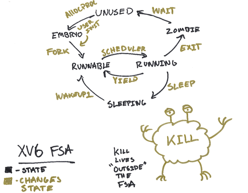// p->lock must be held when using these: enumprocstatestate;// Process state void *chan; // If non-zero, sleeping on chan int killed; // If non-zero, have been killed int xstate; // Exit status to be returned to parent's wait int pid; // Process ID