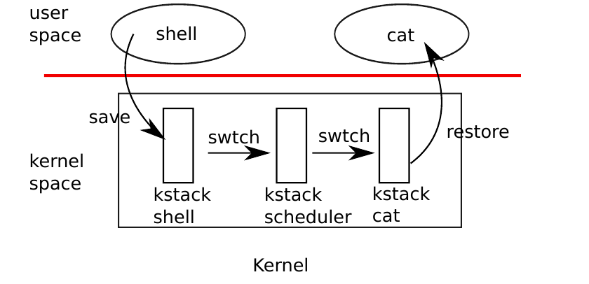 for(p = proc; p < &proc[NPROC]; p++) { acquire(&p->lock); if(p->state == RUNNABLE) { // Switch to chosen process. It is the process's job // to release its lock and then reacquire it // before jumping back to us. p->state = RUNNING; c->proc = p; swtch(&c->context, &p->context); // 保存context(上下文)