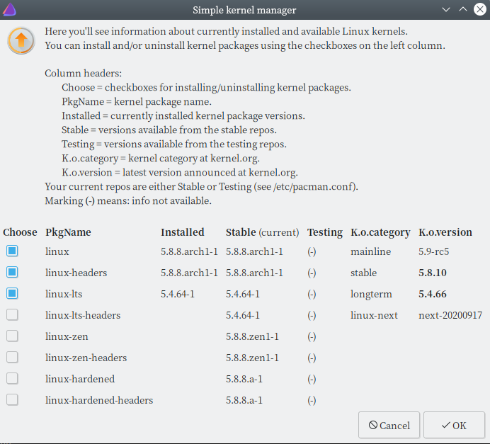 不过大方向是走对了,基本上就做做开箱即用和一些代替命令操作的图形界面,没有像Manjaro那样各种魔改搞出很多Arch上反而没有的问题。就比如linux内核切换的图形界面akm,基本上就是代替了archwiki上的手动操作,选项也只有linux,linux-lts,linux-zen几个。不像Manjaro那个内核切换,从linux 5.3 到linux 5.8最新版全都有,非常奔放,你要是真随便选一个linux和linux-lts之外的,哪天滚着滚着就出问题了。